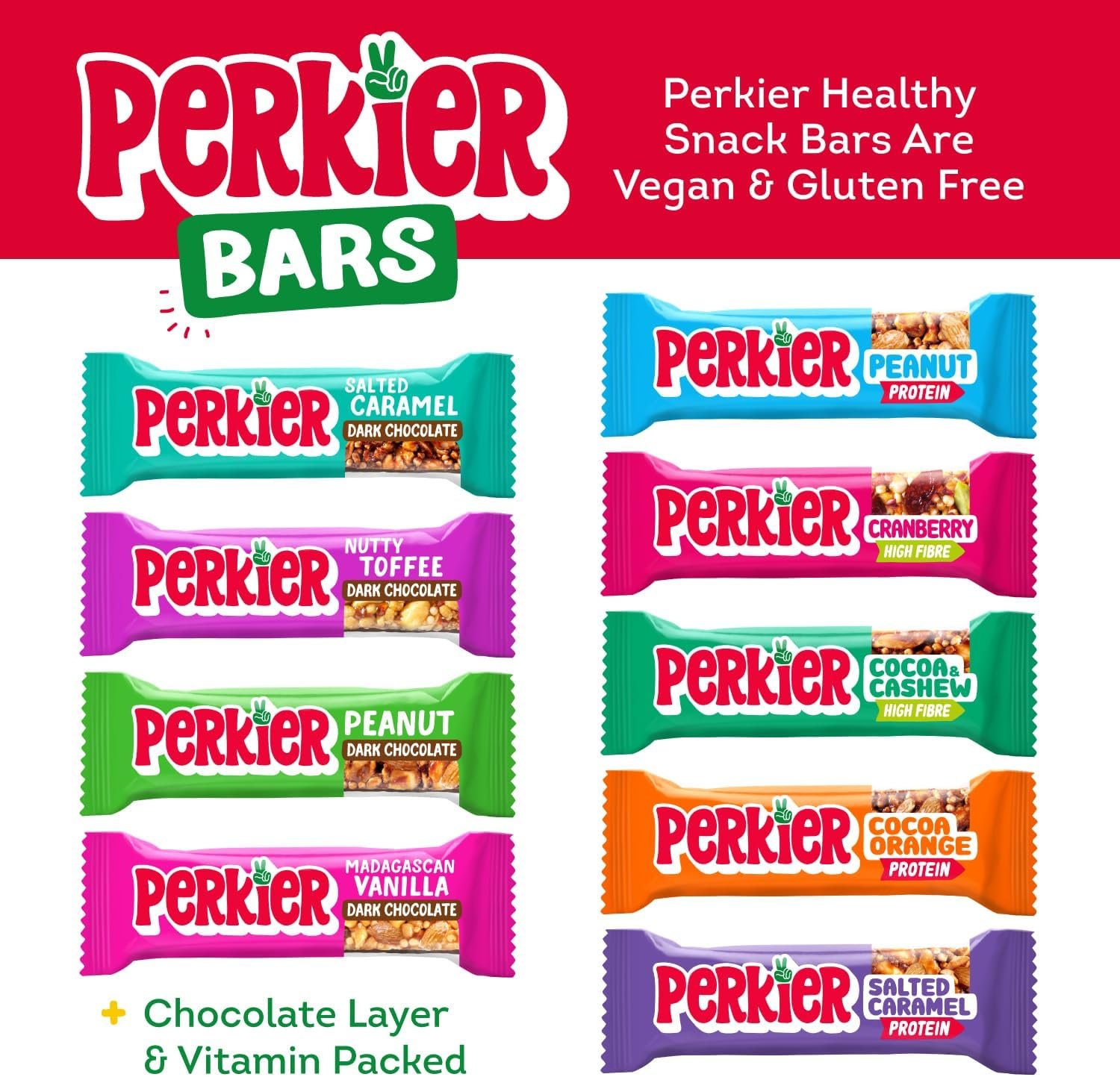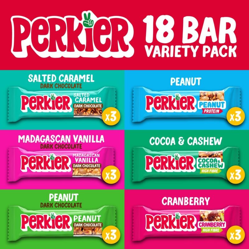 【Flash Sale】Perkier Variety Box (18 bars), Vegan, Gluten Free, Protein, Lower Sugar, Healthy Snacks for Adults, Low Calorie, Halal, Breakfast Bar, High Fibre, Nut, Cereal, Gut Health, Multipack, Plant Based