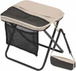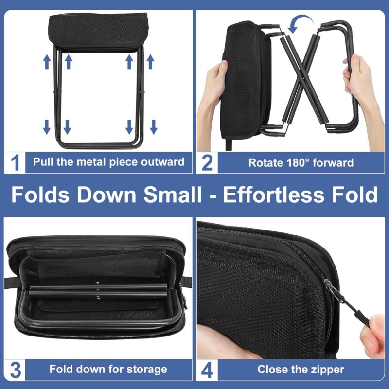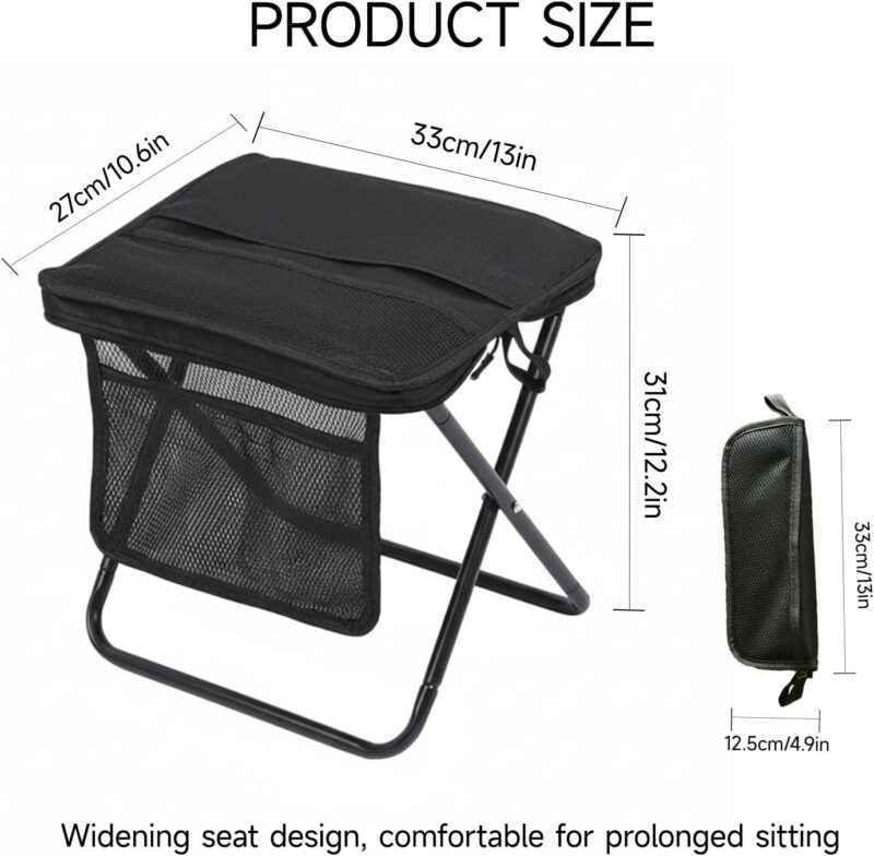 Lightweight camping stool with a black metal frame. ideal for outdoor activities and easy to transport when folded.