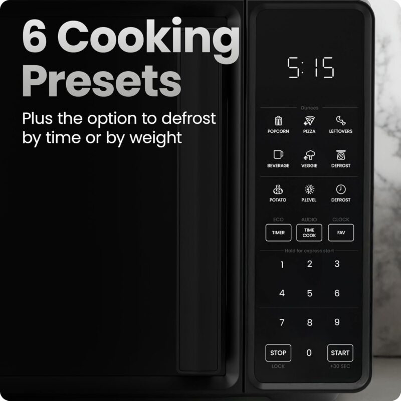 • EXTRA-QUICK COOKING: Choose from six popular presets for microwave ovens. including popcorn. pizza. beverages. veggies. potatoes. or leftovers. Or just press the number keys to quickly set the cook time for that number of minutes.