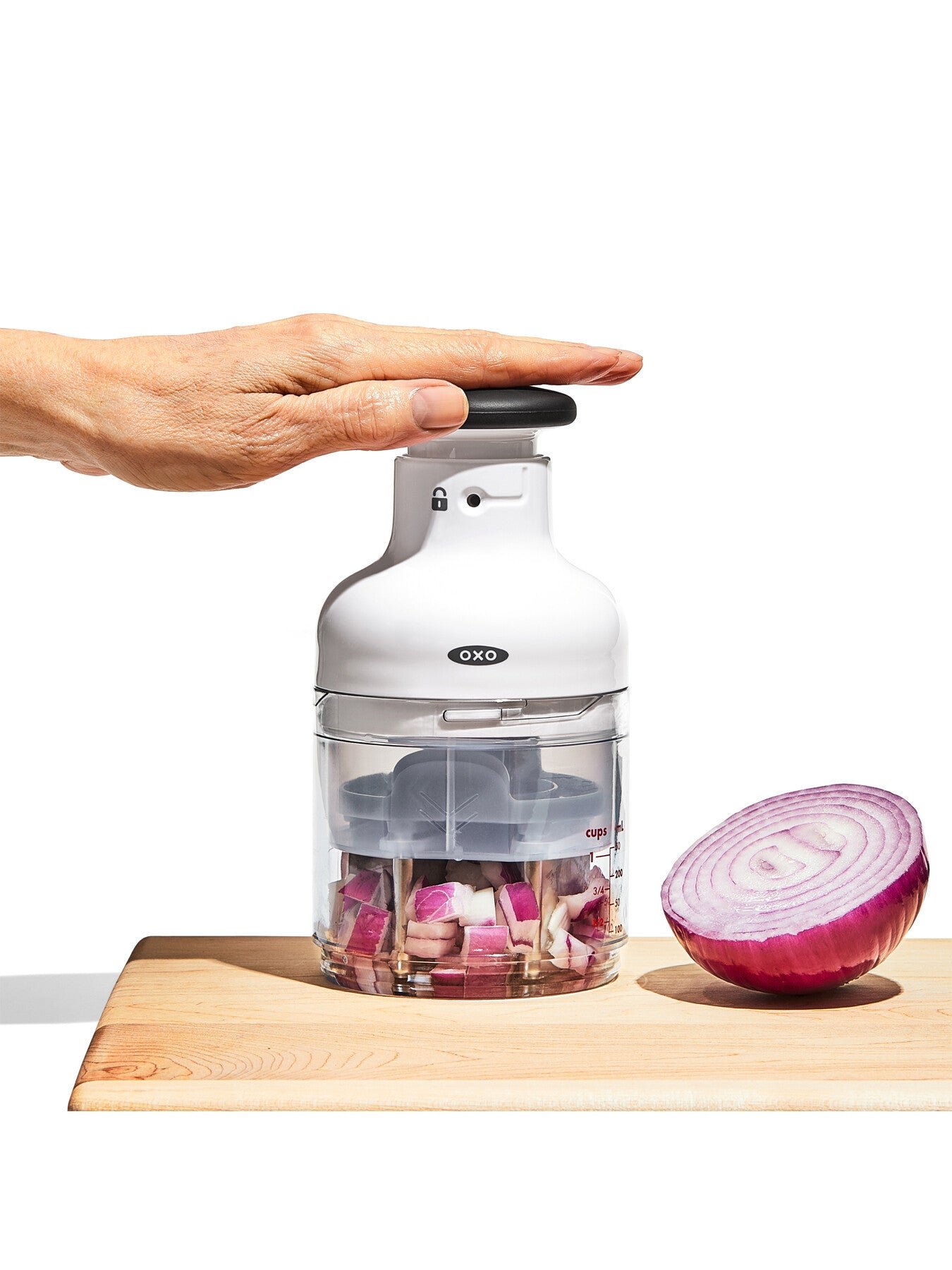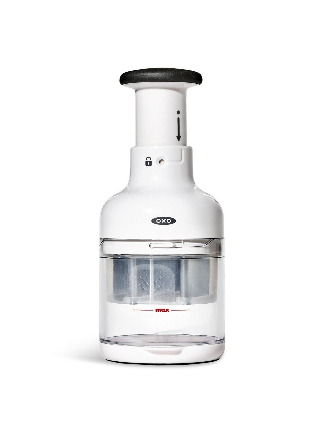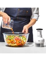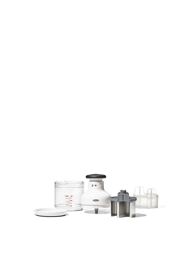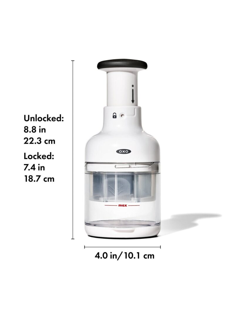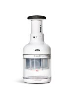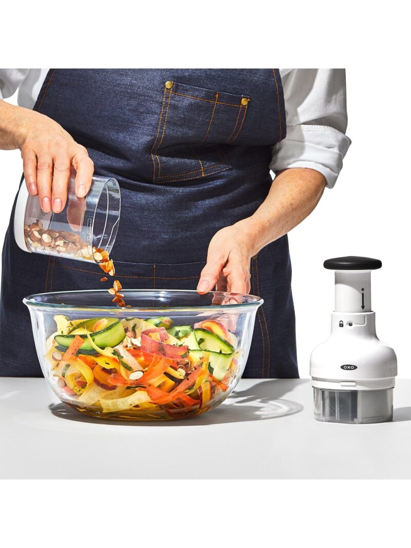 Need to chop up onions. celery and carrots for a soup? How about some tomatoes and cilantro for a salsa? Or nuts for a batch of brownies? The OXO Good Grips Chopper can handle all these tasks much faster than your chef’s knife. (It’s safer. too.) It incorporates a sharp. stainless steel blade that rotates with every single press of the knob. resulting in evenly sized pieces. Load it up and then just press the knob to start chopping.