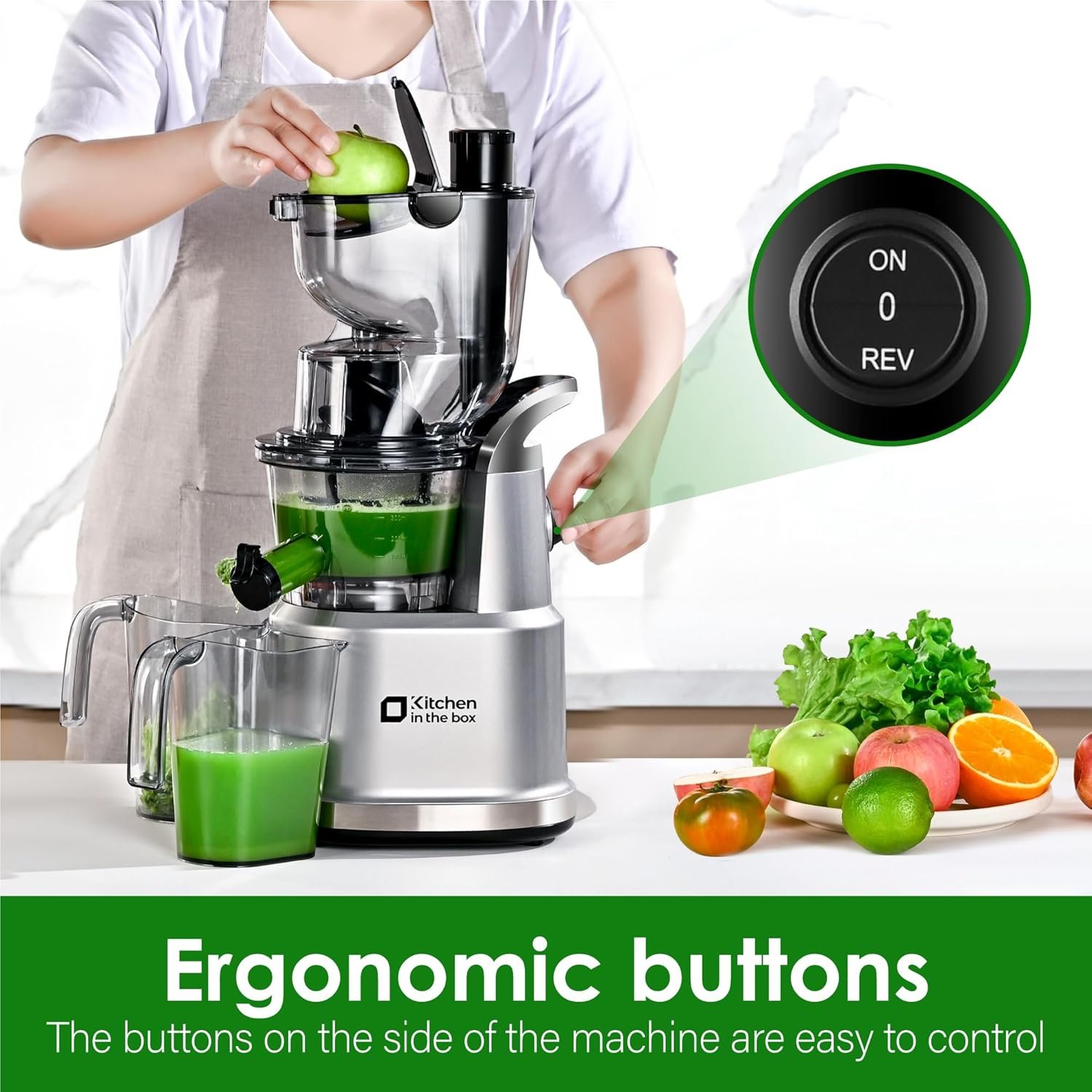 - 【Wide Chute Design】Our Kitchen in the Box Cold Press Juicer Machines feature a large 83mm feed chute. allowing you to easily juice whole and chunky fruits without the need for chopping. Additionally. the 32mm feed chute is perfect for long vegetables. providing you with versatile juicing options. Say goodbye to time-consuming preparation and enjoy the convenience of different ingredient combinations for your juices.