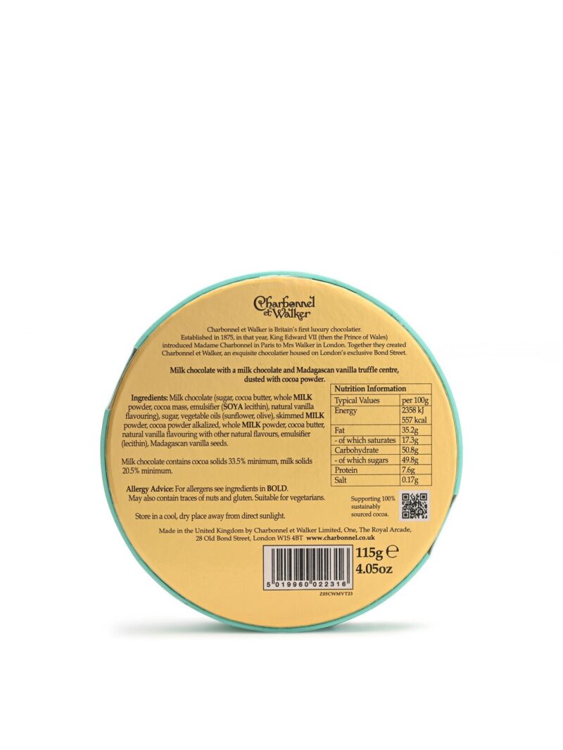 A classic truffle from Charbonnel et Walker. Enjoy these delectable Milk Chocolate Truffles with a creamy Madagascan Vanilla centre. a generous coating of Milk Chocolate and lightly dusted with a little cocoa powder for the perfectly balanced truffle.