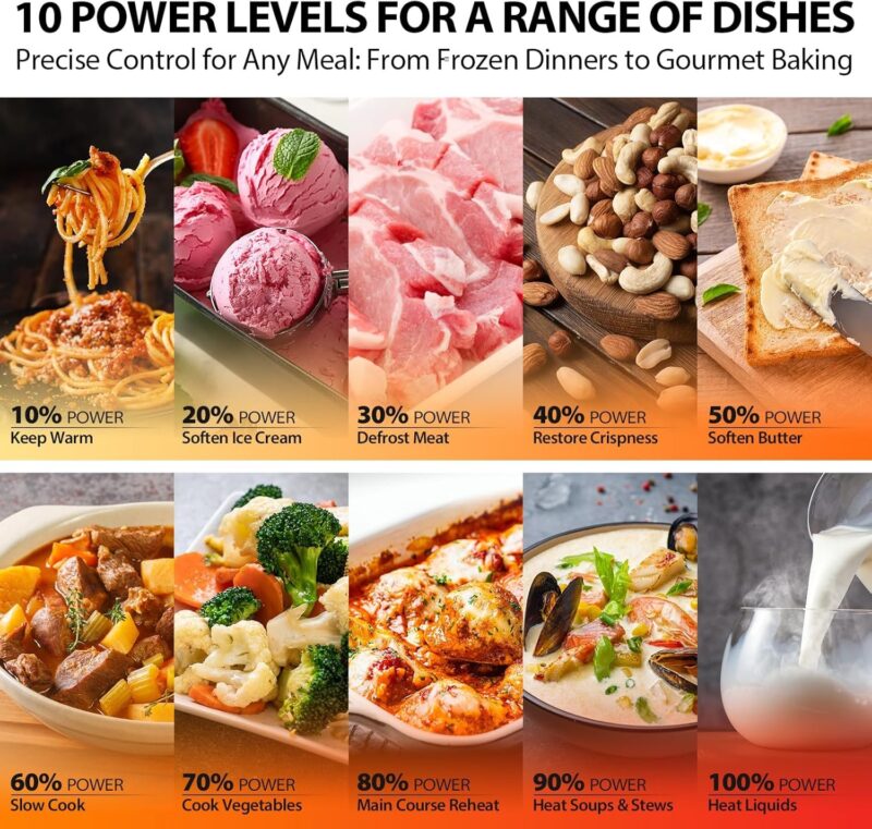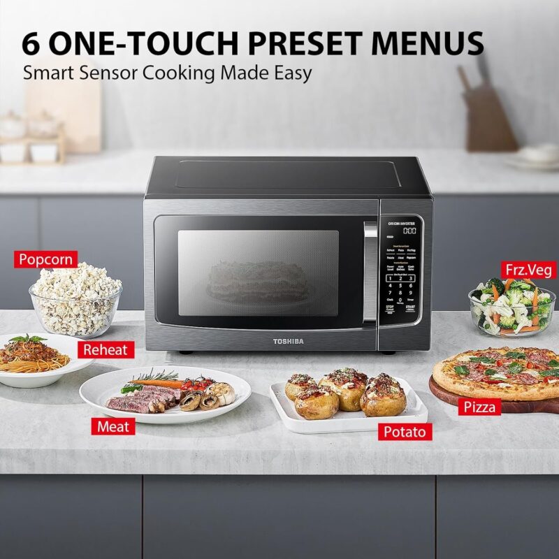 - 6 Smart Sensor Auto Menus: Pre-programmed sensor menus for optimum heating of popular foods like pizza. potato. vegetables and more. Smart sensor will automatically adjust power and keeps food texture.